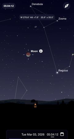 In preparation for the eclipse it is critical that you check the elevation of your yard or a nearby observing location. Even when totality begins at 5:04 am with the Moon 16 degrees up in the sky, many backyard locations will not allow observing of the eclipse due to the height of trees and homes.
